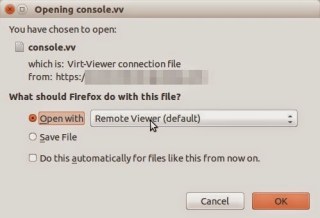 Para poder ver la consola, desde Ubuntu deberemos instalar el paquete virt-viewer. Al acceder a la consola con Firefox nos pedirá con que programa abrirlo, a lo que deberemos seleccionar «Remote viewer»