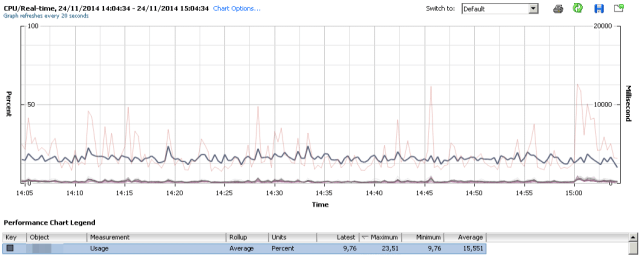 Como hemos comentado esta métrica es realmente importante para determinar si estamos teniendo problemas de rendimiento. En el cliente de vSphere esta métrica se representa en segundos, mientras que con un ESXTOP se devuelve en porcentaje.