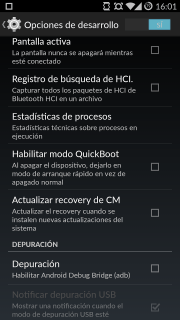 Debemos activar el modo Depuración. Para ello habilitaremos primero las opciones de desarrollo. Iremos a Ajustes-> Información del teléfono y tocaremos 7 veces en compilación. Una vez habilitado en el menú principal de los ajustes nos saldrá la opción «opciones de desarrollo». Una vez dentro habilitaremos el debug de USB en el teléfono dejándolo como en la siguiente imagen: