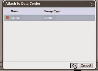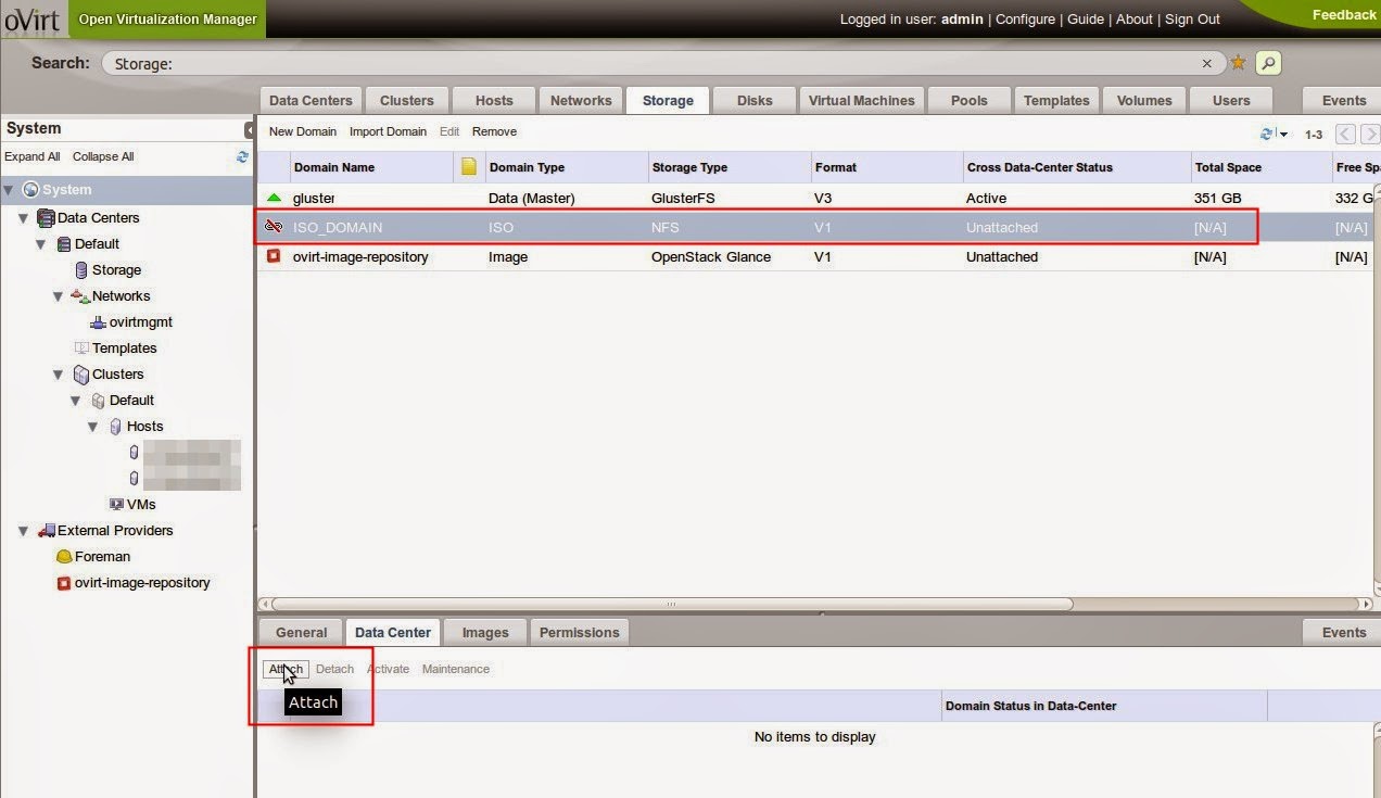 Durante la instalación se ha creado un Storage Domain que debemos configurar y que aparece como «Unattached». Al seleccionarlo, en la consola inferior seleccionamos la pestaña «Data Center» y a continuación lo activamos con el boton de «Attach»: