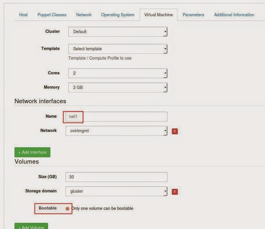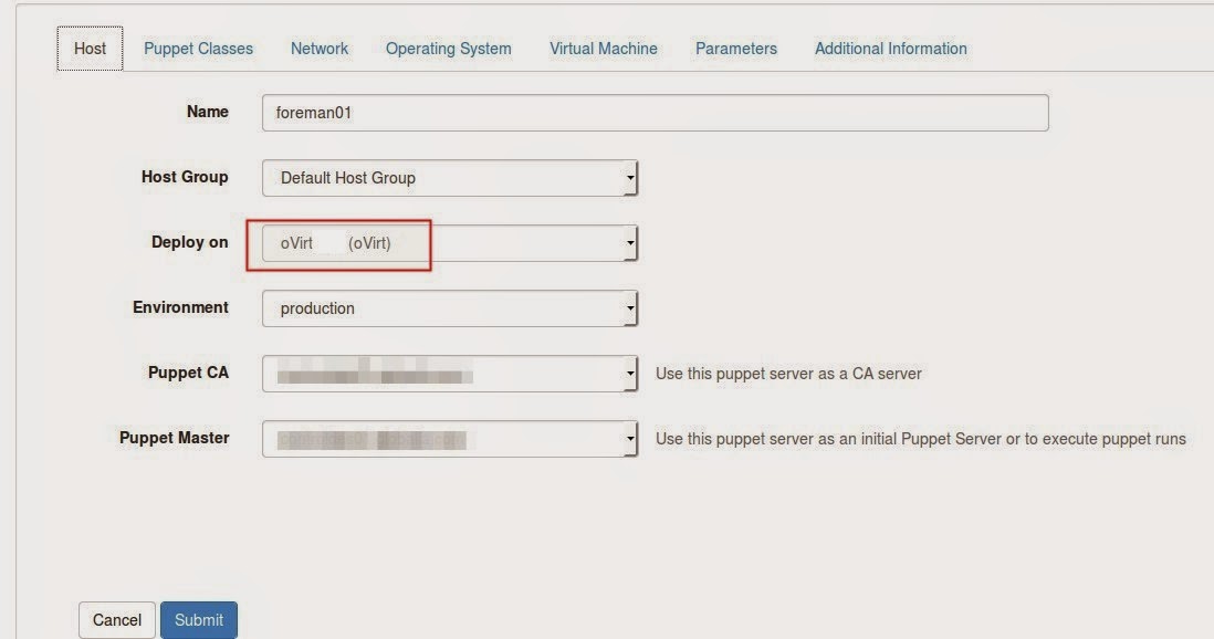 En la interfaz de Foreman, iremos a añadir un nuevo Host, y tras ponerle el nombre y asignarle el Host Group le pondremos que el despliegue se realice sobre oVirt. Esta opción se ha habilitado gracias a la integración que hemos configurado anteriormente. Veremos además que aparece una nueva pestaña de «Virtual Machine» donde podremos configurar parámetros específicos: