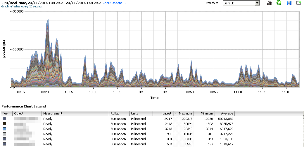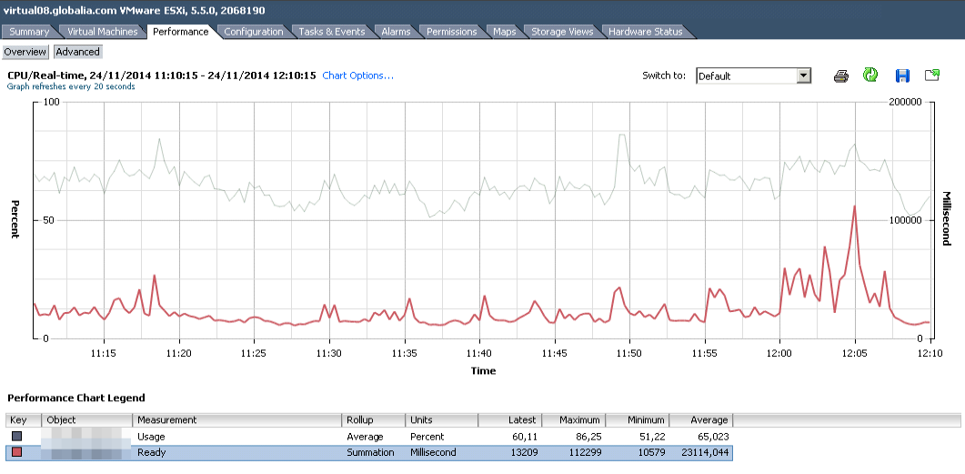 Sin embargo en momentos puntuales llegamos a tener contención y el CPU ready se dispara como podemos ver en esta gráfica donde aparece el acumulado en el host. Esto es debido a que estas máquinas forman parte de un servicio que hace que todas tengan una carga intensiva de CPU en momentos puntuales haciendo que el CPU Ready suba tanto que al final el rendimiento de las máquinas es peor del esperado: