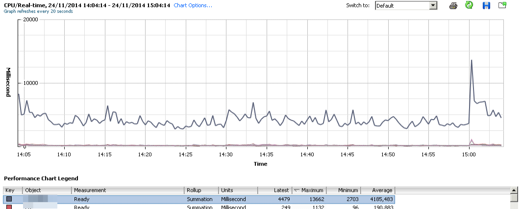 Como vemos en las gráficas de rendimiento de estas «Monster Machines», en momentos puntuales el CPU Ready se dispara a la vez, llegando a los 13 segundos: