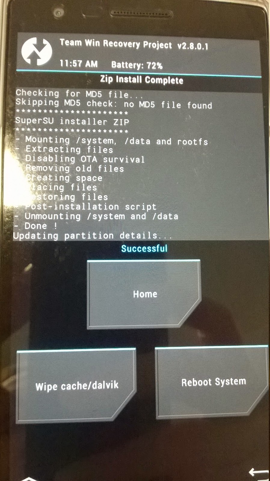 Una vez se haya completado correctamente, reiniciar el teléfono en modo recovery para verificar la instalación. Para arrancar en modo recovery con el teléfono apagado pulsar las teclas Volumen-Abajo y la tecla de encendido.